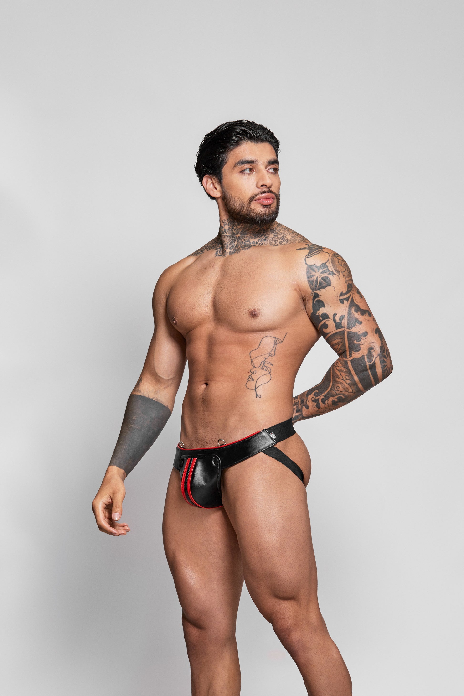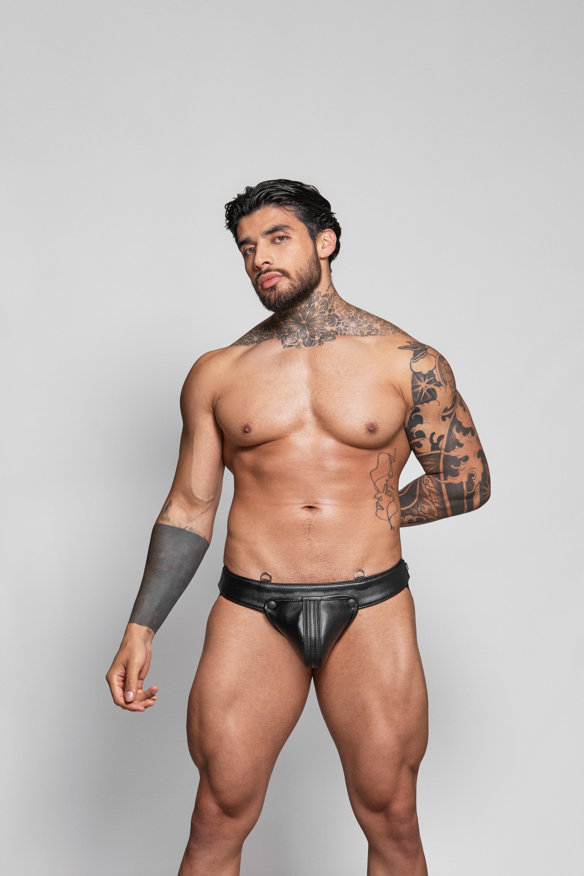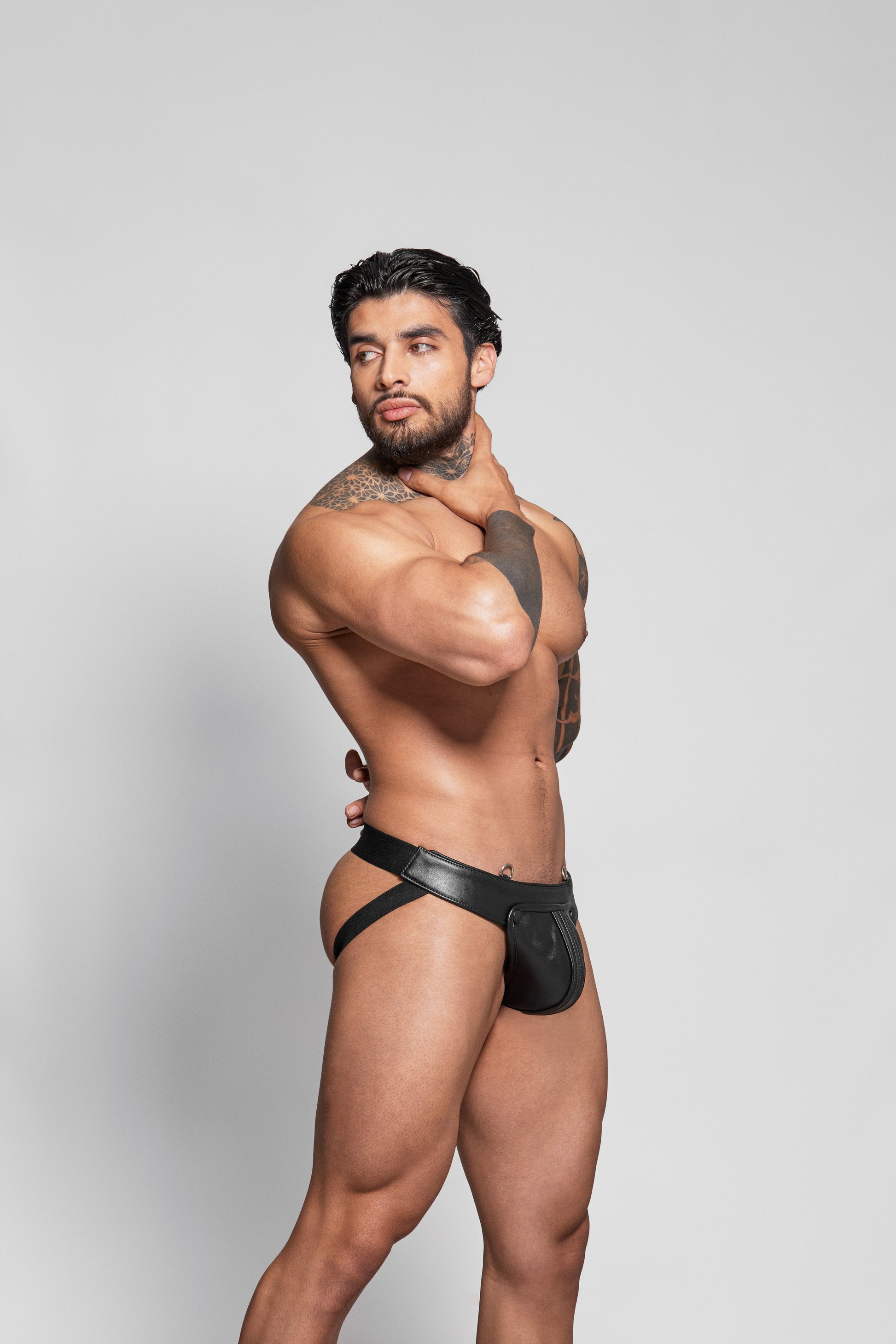 The Dale Mas Eco Leather Jock looks and smells like leather but is made of eco leather. Eco leather is plant based instead of animal based. This jock has a full removable pouch that connects with 3 snap buttons. Features two racer stripes down the center of the pouch. The jock has attached D-rings for connecting a full body harness. The jock itself has an o-ring in the front which connects to the elastic leg straps. Both the leg straps and rear of the waistband are made of elastic so the garment has some stretch for proper fitting.