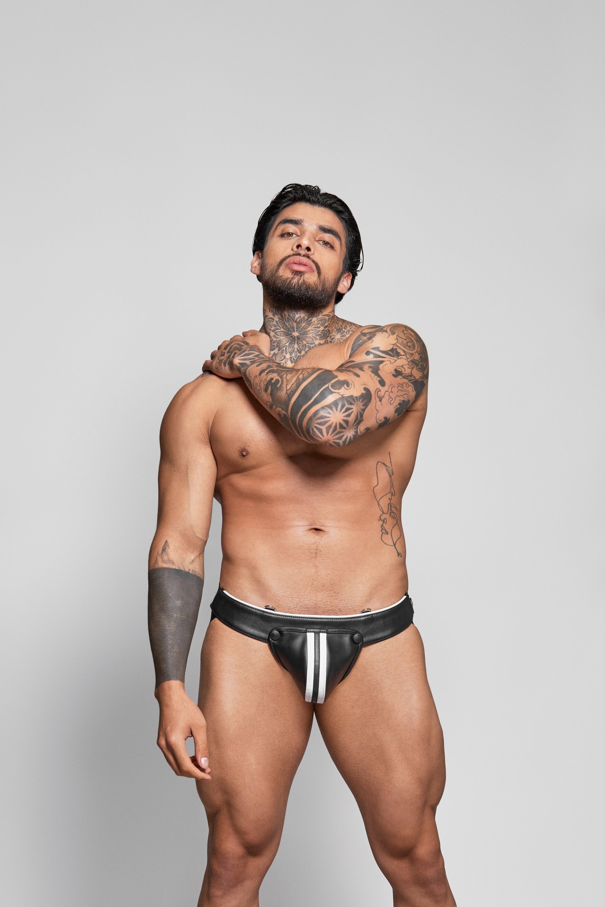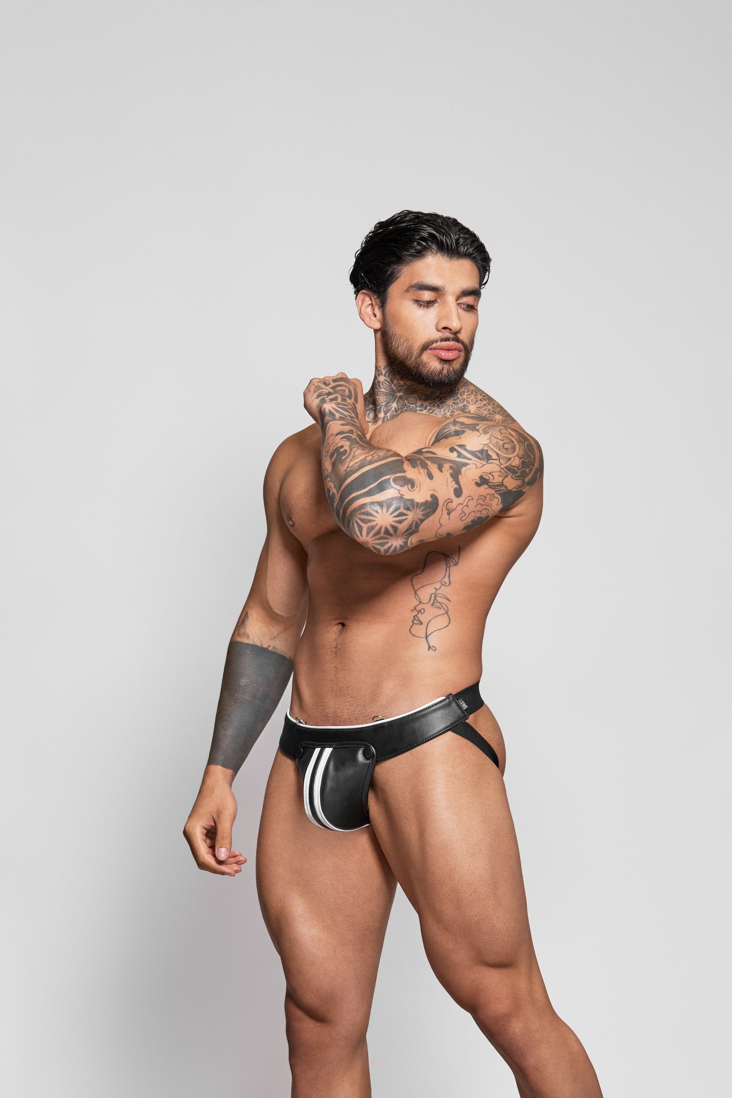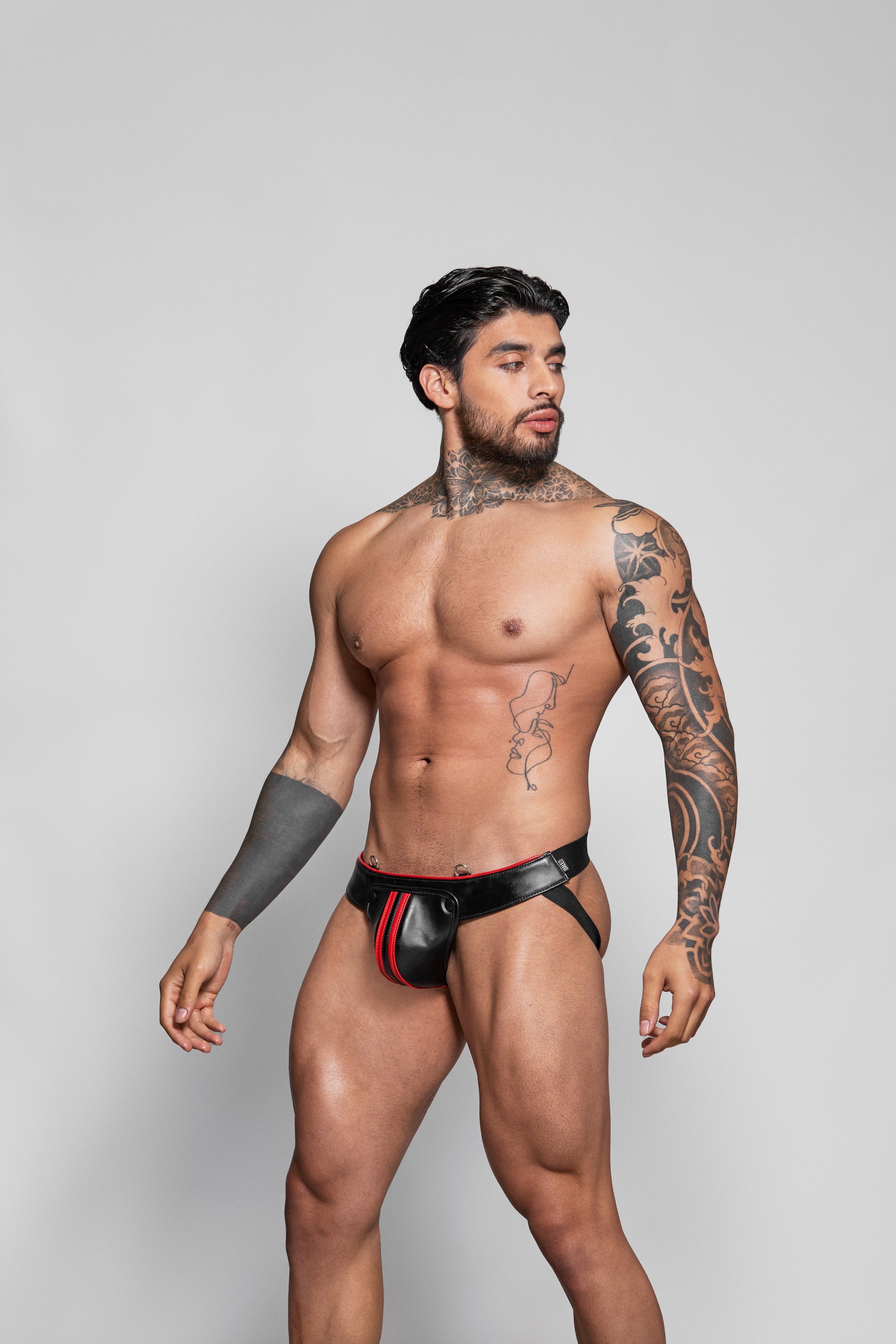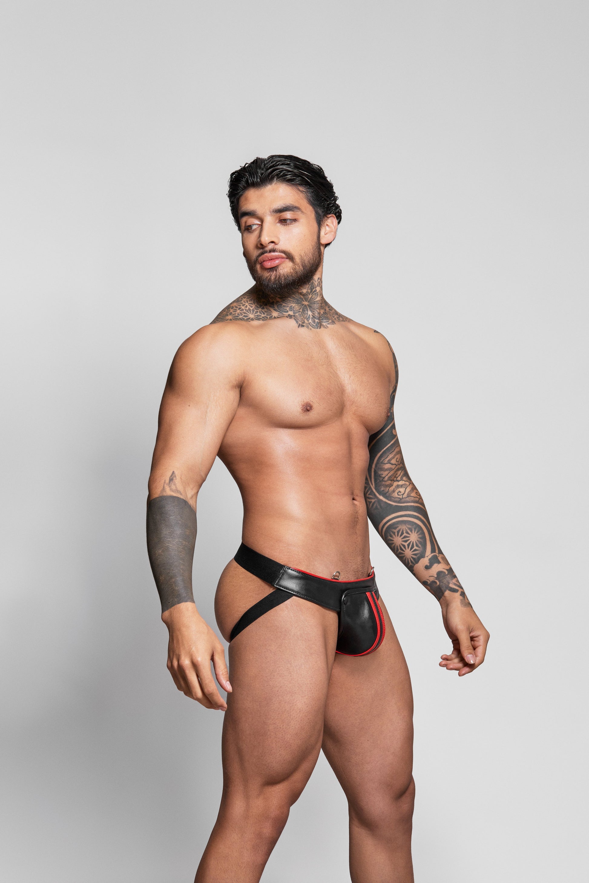 The Dale Mas Eco Leather Jock looks and smells like leather but is made of eco leather. Eco leather is plant based instead of animal based. This jock has a full removable pouch that connects with 3 snap buttons. Features two racer stripes down the center of the pouch. The jock has attached D-rings for connecting a full body harness. The jock itself has an o-ring in the front which connects to the elastic leg straps. Both the leg straps and rear of the waistband are made of elastic so the garment has some stretch for proper fitting.