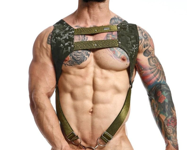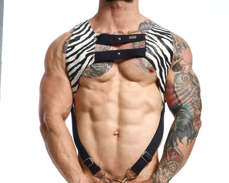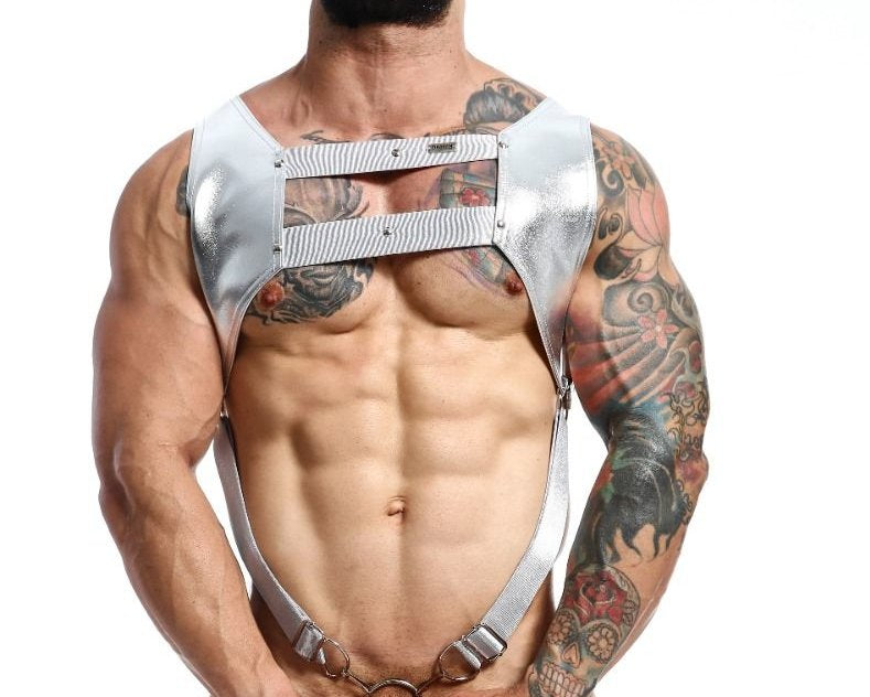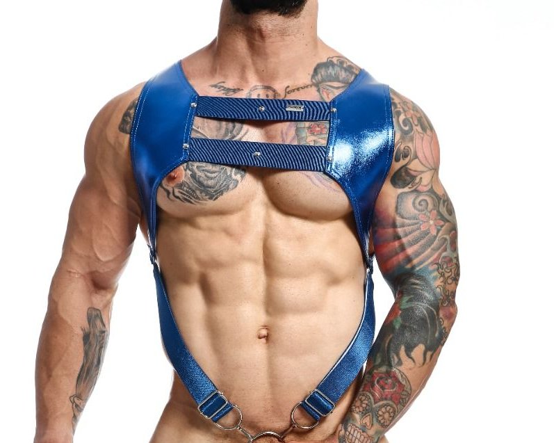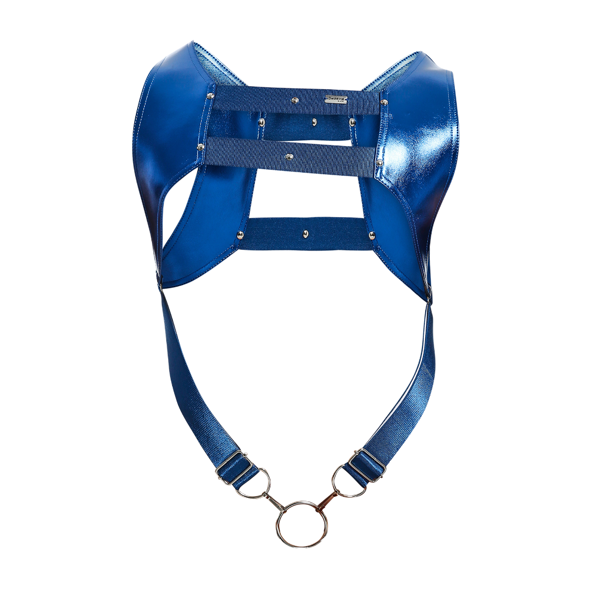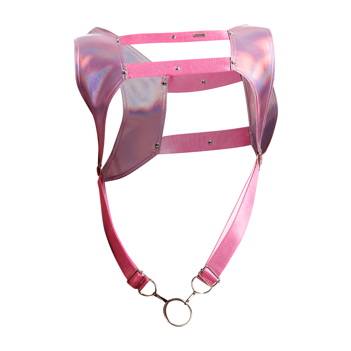Unique harness with a crop-top looking upper half with metallic spike accents. Wide straps lead down to a metal c-ring. One size fits most as this product is adjustable. Made with a leather-looking material of 65% Polyurethane 35% Rayon viscose.