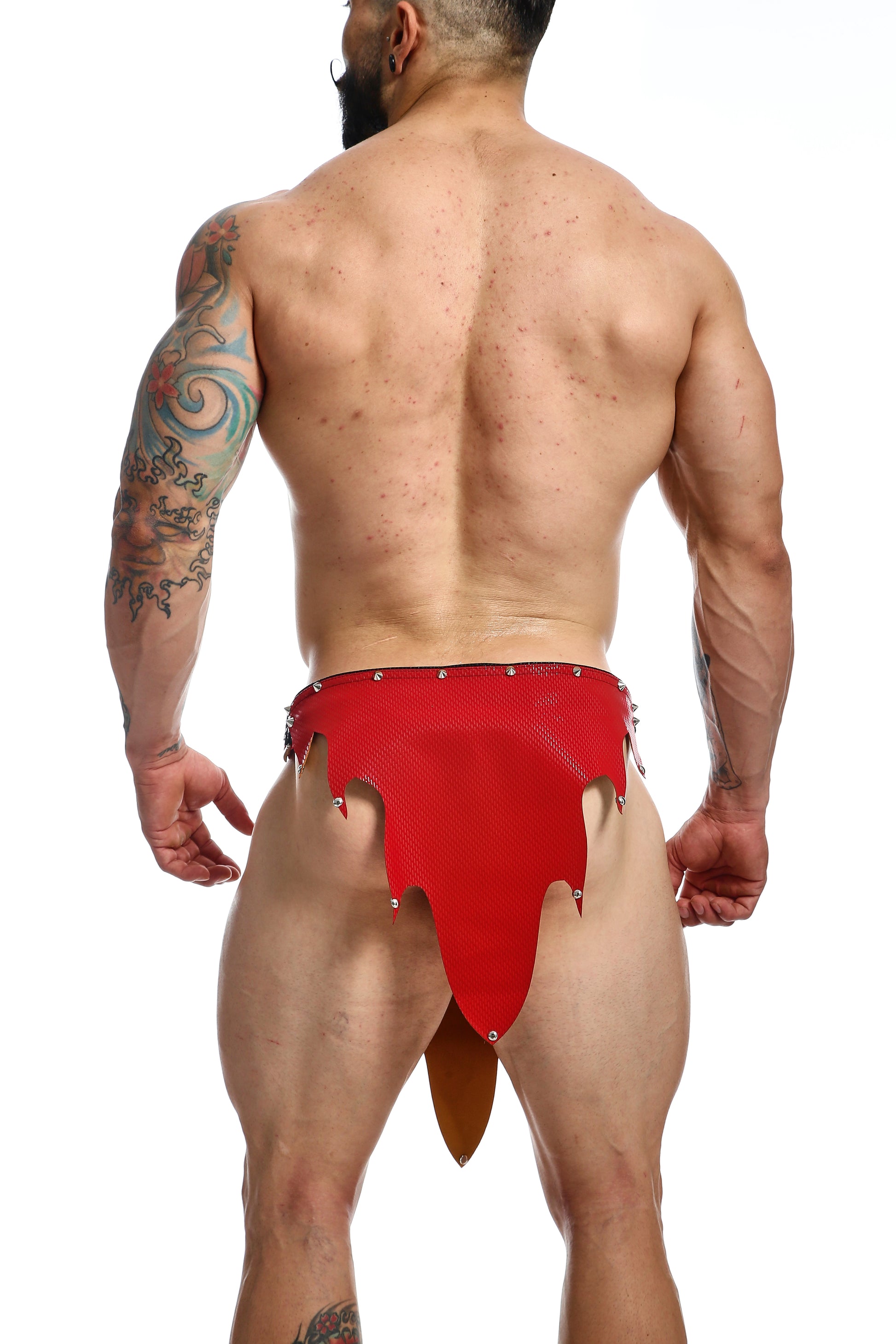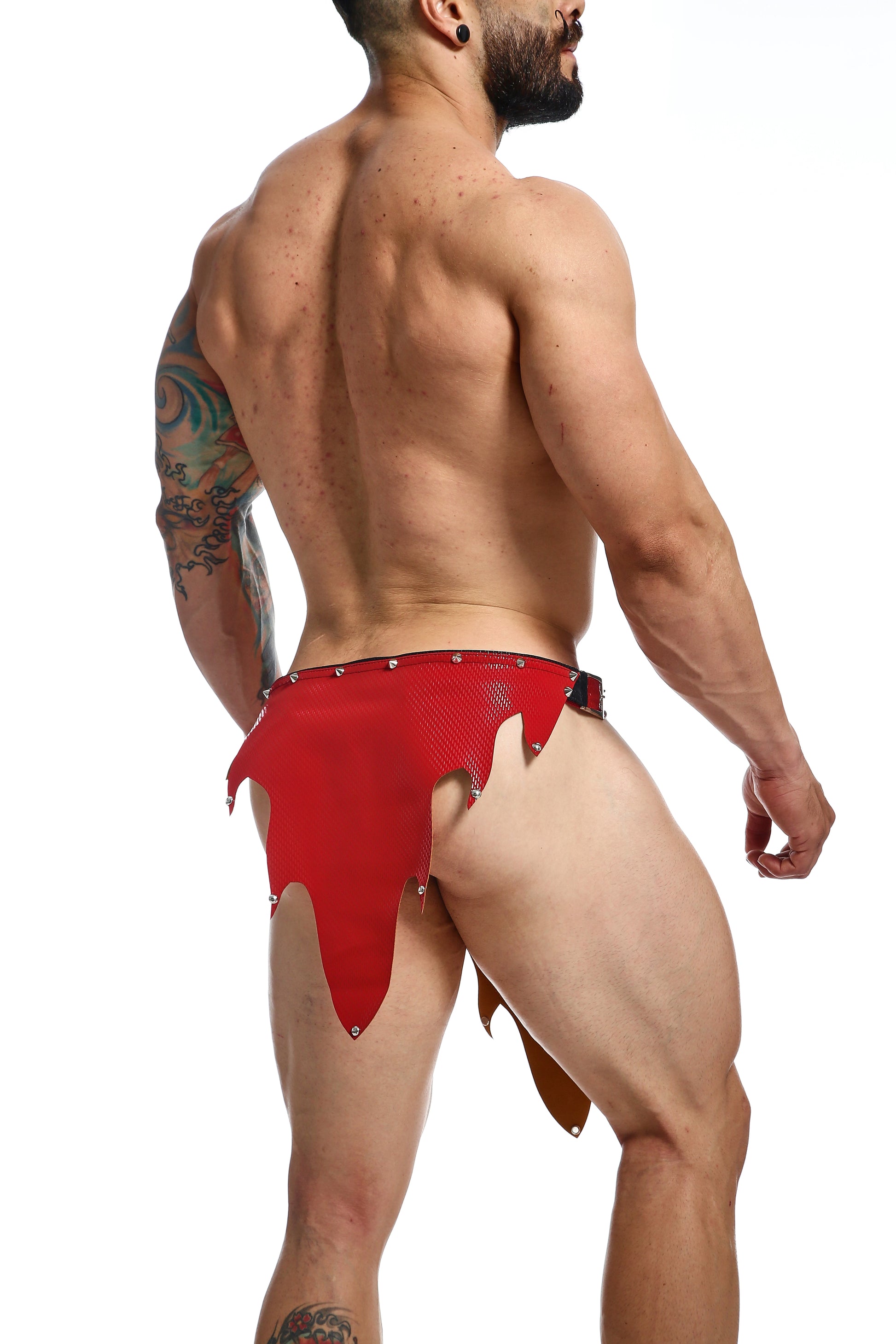 Sexy Roman skirt now in a new FIRE style. Made of a soft microfiber fabric that looks like leather. Adorned with metallic details. Open on the sides. Fire design on the back and front. Composition: 65% Polyurethane 35% Rayon viscose.