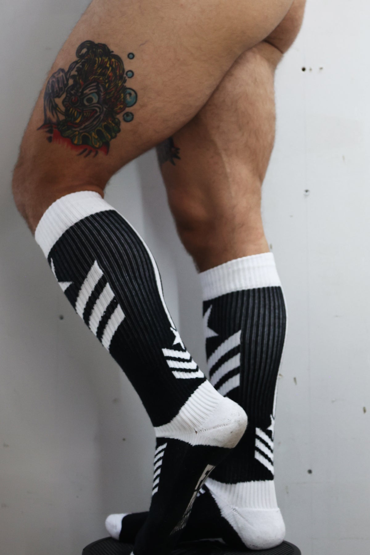 Just as we all like to support the troops, the new COCKPIT SOCK supports your calves. Made of a soft yarn that hugs your form (and keeps its form), the COCKPIT SOCK features military stars and stripes.