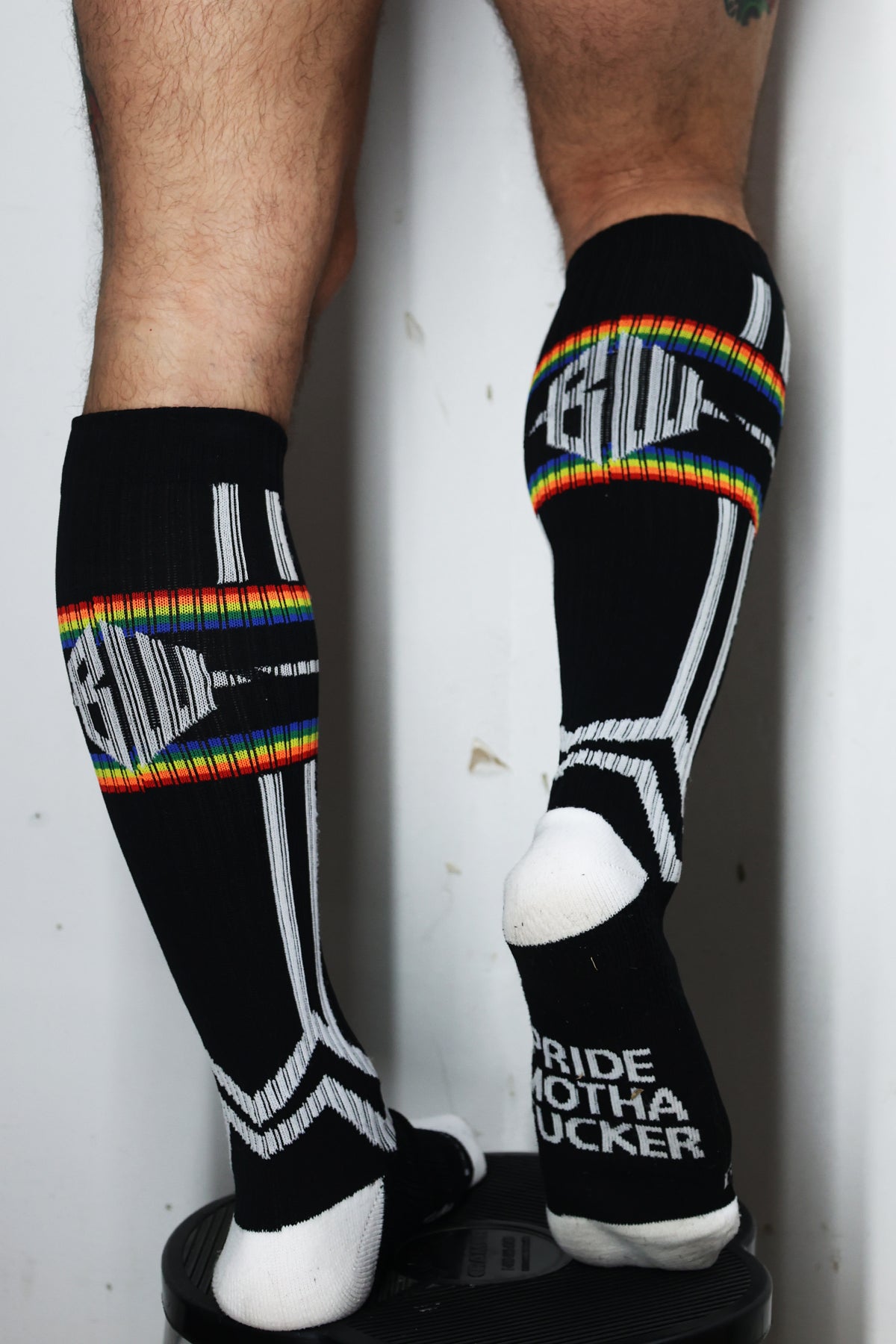 Our new PURE PRIDE SOCK is made of a heavy-ribbed fabric, with a truly bold black/white/rainbow stripe design. The BREEDWELL logo on the back and the “PRIDE MOTHAFUCKER” message that people will only see when you’re on yours, make these socks the perfect pride accessory.