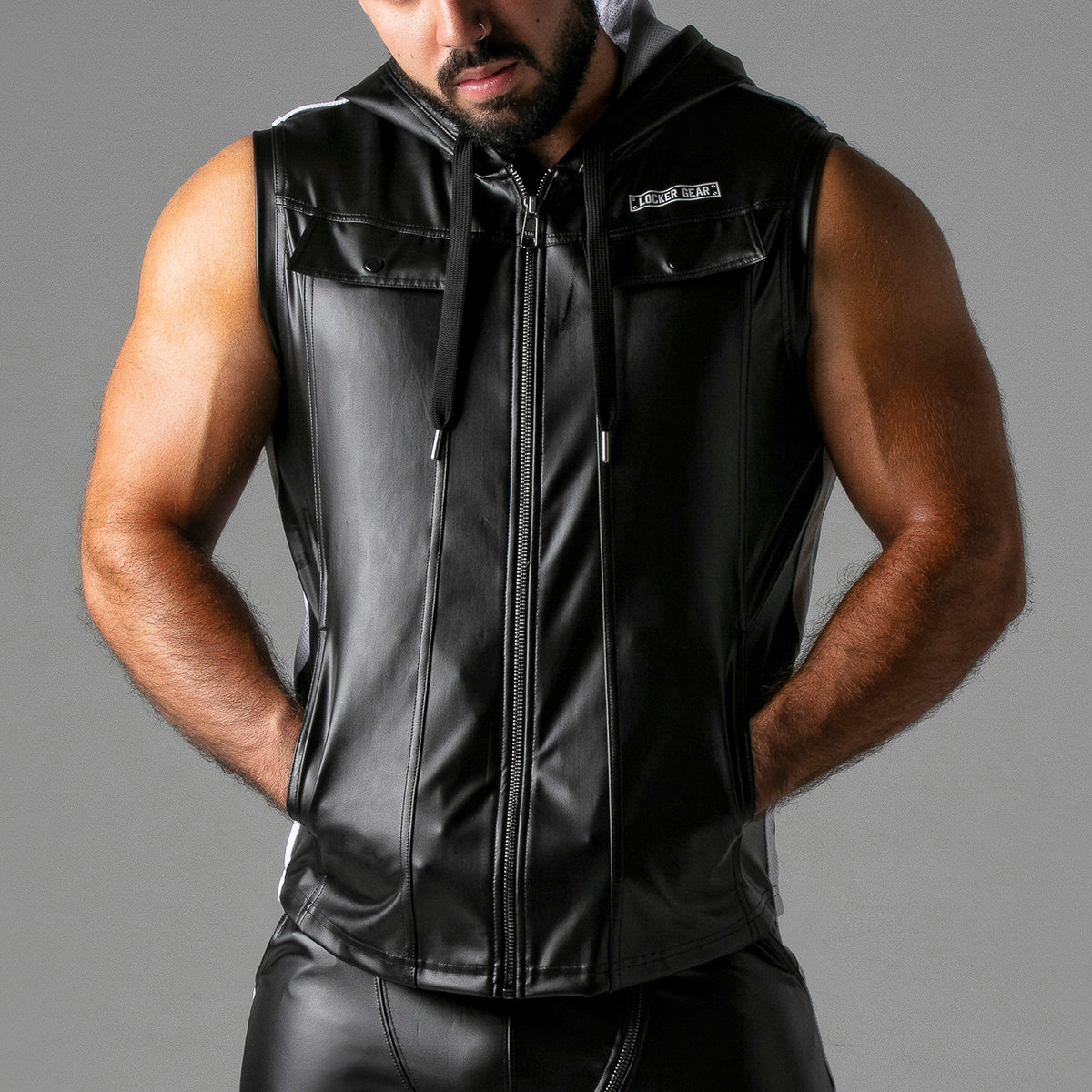 Sleeveless hoody, made from the finest leatherette stretch fabric. Features a full front zipper with pinhole side bands in contrast colors. Printed Locker Gear logo on the chest.